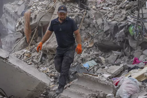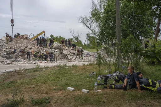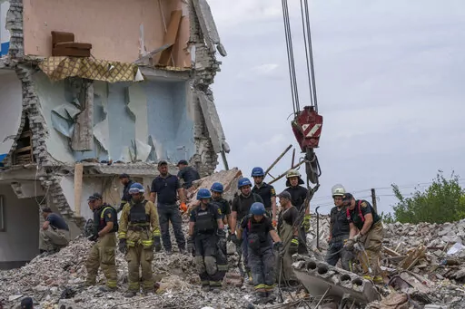 CHASIV YAR, Ukraine (AP) — Dozens of Ukrainian emergency workers labored Sunday to pull people out of the rubble after a Russian rocket attack smashed into apartment buildings in eastern Ukraine, killing at least 15 people. More than 20 people were believed still trapped.
