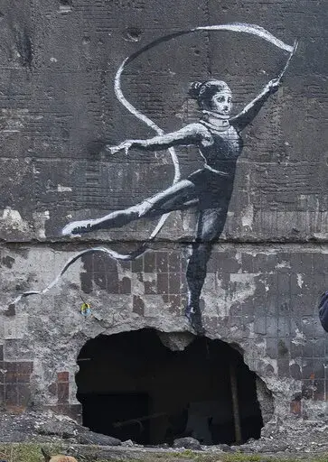 A delicate painting of a gymnast doing a handstand has popped up on the wall of a wrecked building outside of Kyiv and appears to be the work of the British graffiti artist known as Banksy.