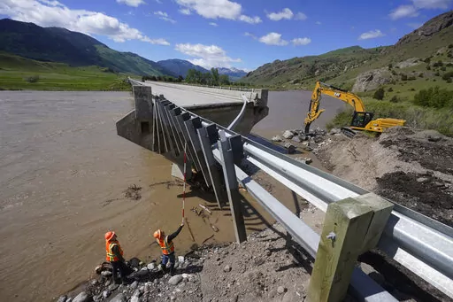 In the town of Gardiner, a driveway curved past a small house and appeared to drop off at the edge of the eroded bank of the Yellowstone River that sparkled silver in the sun. Until early Monday evening, it had led to a large house that was home to six park employees and their families. They had evacuated before it toppled into the roiling rapids and was carried 5 miles (8 kilometers) downstream before sinking.