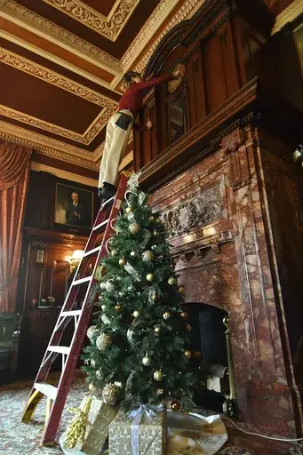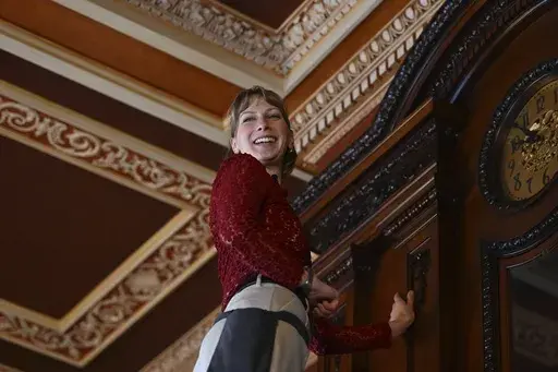On a recent morning, Bethany Gill demonstrated how it's done — going room to room with an array of ladders and custom tools. She opens the glass covers, rotates the mechanisms enough to keep them going for about a week and checks their accuracy before moving on to the next one.