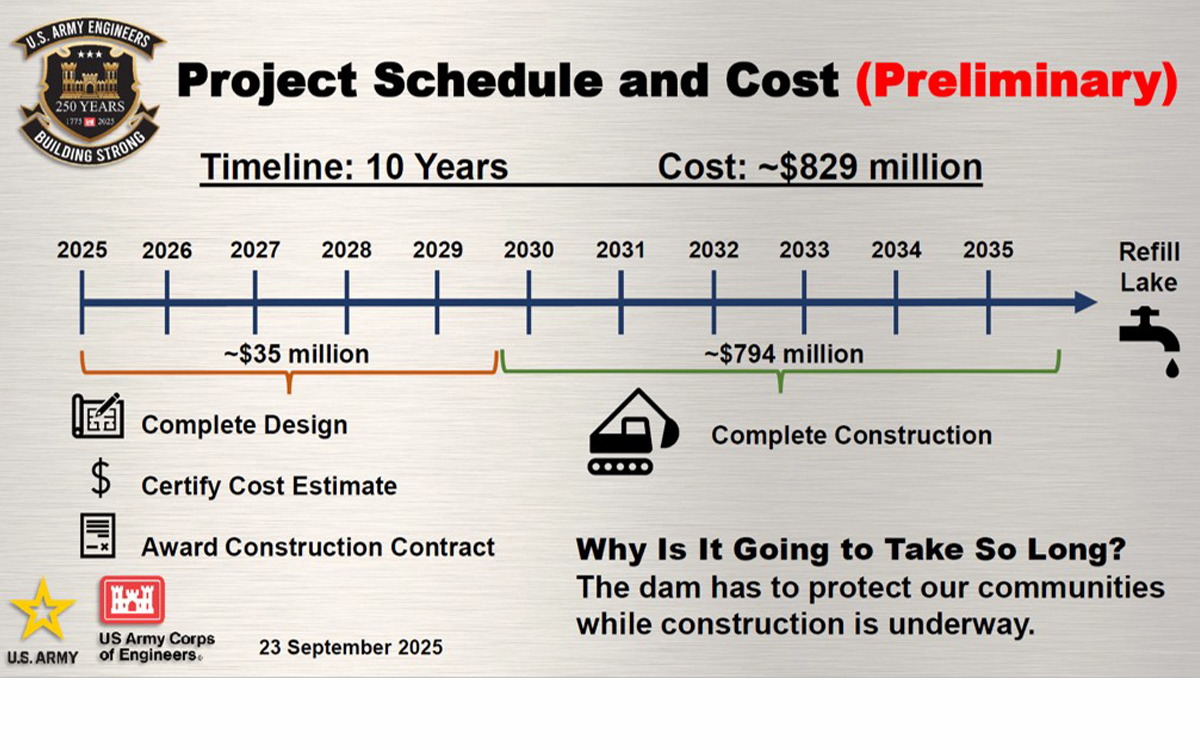 He said the Corps began planning repairs in 2023 and they now call for building a massive coffer dam just north of the existing control tower, digging to the dam’s base and then constructing a modern water control tower.