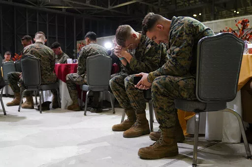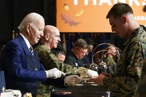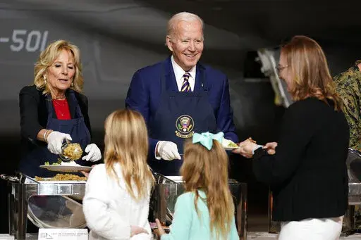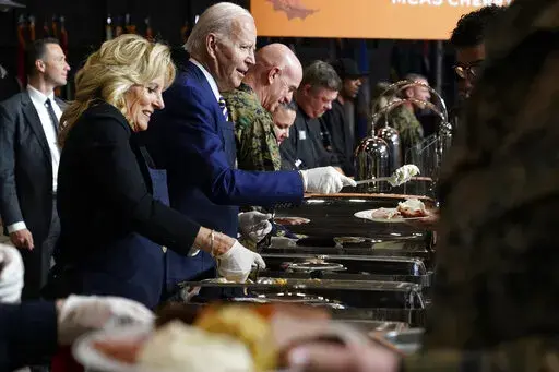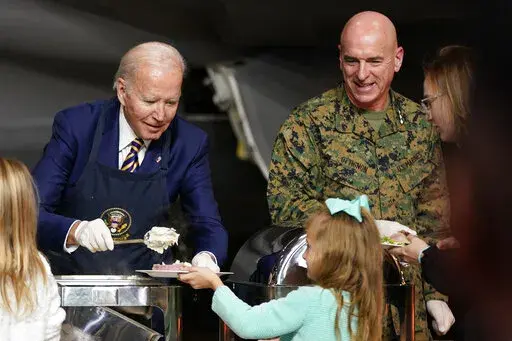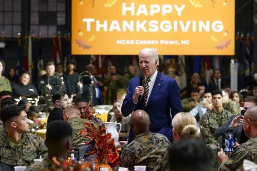 Later Monday, the Bidens traveled to Marine Corps Air Station, Cherry Point, near the North Carolina coast for “friendsgiving,” or to share a Thanksgiving-style meal with members of the military and their families. The first couple expressed gratitude for their sacrifices to the roughly 350 people in attendance.