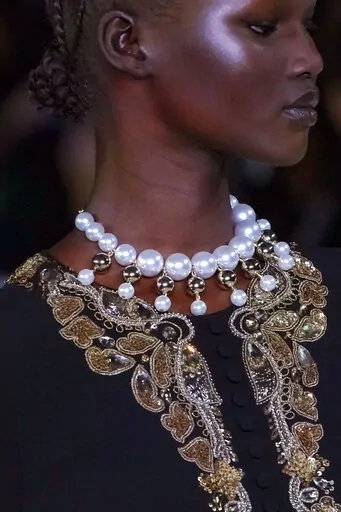 Some of the most gasp-worthy looks were inspired by Empress Elisabeth of Austria, recently given a modern edge in the film “Corsage.” One model wore a chunky pearl necklace with a buttoned-down black silk full-length dress featuring gold embroidery. Another look featured a square-necked Cinderella dress in lilac satin with a peek of black tulle and matching lilac pumps.