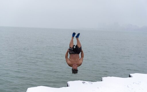 With the lake temperature 34 degrees (1 Celsius), the bare-chested O’Conor did a running jump from the snow-covered shore to launch a forward flip into the icy gray water.