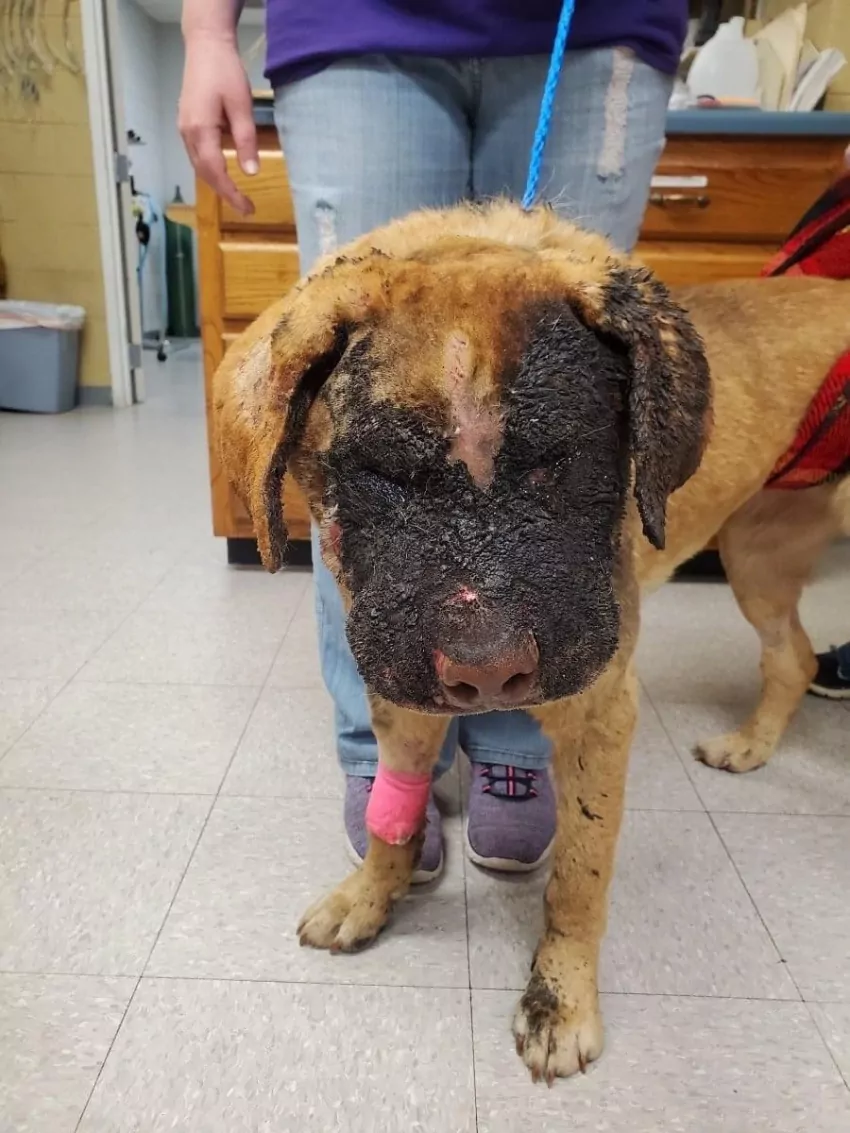 Buddy is currently under around-the-clock care at the College of Veterinary Medicine at Mississippi State University where the removal of charred and damaged skin from his face began early last week.