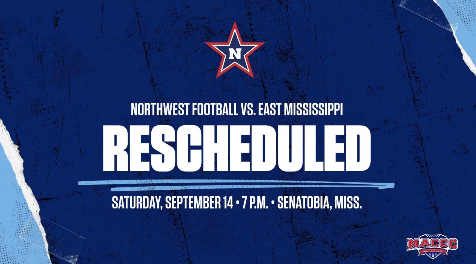 SENATOBIA - Due to anticipated inclement weather associated with Hurricane Francine, Thursday's football contest between Northwest and eighth-ranked East Mississippi has been pushed back to Saturday, September 14 at 7 P.M.