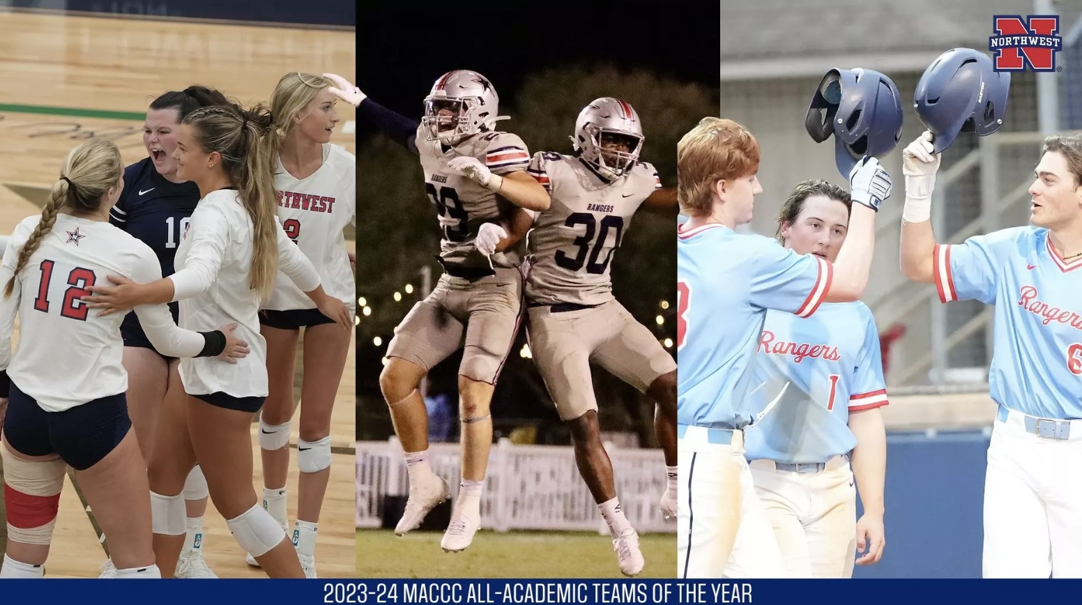 For football, coach Benjy Parker's team finished with a 3.16 team GPA, earning MACCC Academic Team of the Year honors for the first time since the 2021-22 school year. This marks the third time in the last four years that the Rangers have earned the highest GPA among MACCC football programs, as Northwest also collected Academic Team of the Year honors for the 2020-21 school year.