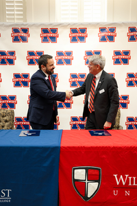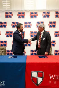 Northwest Mississippi Community College President, Dr. Michael Heindl, and William Carey University President, Dr. Ben Burnett, came together at the Northwest Mississippi Community College Senatobia campus on Wednesday, January 31 to sign an agreement linking the two institutions to promote more students to transfer after receiving their associate degree at Northwest.