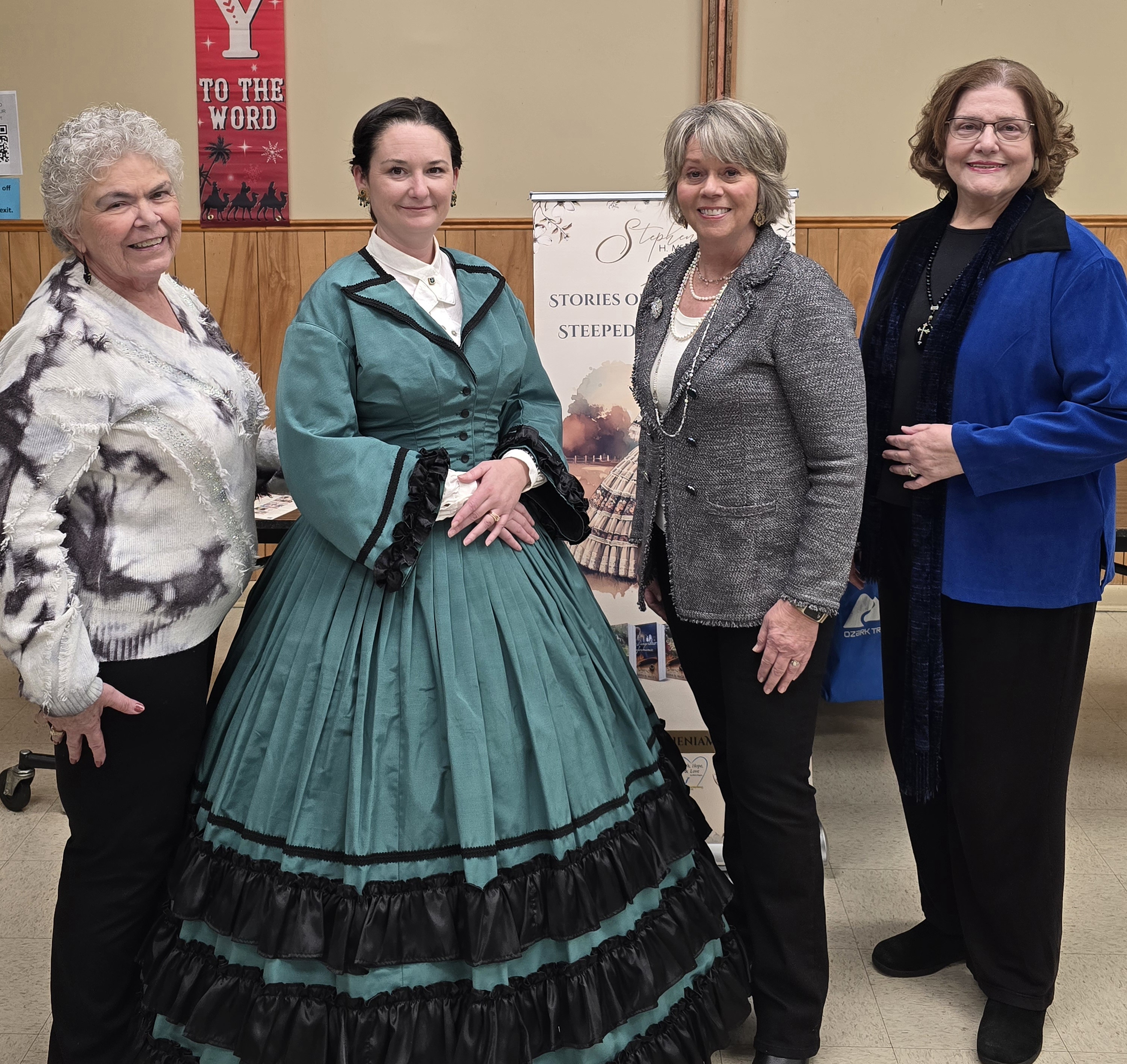 As the meeting’s highlight, Stephenia H. McGee, a Mississippi author of Christian historical fiction, shared photos of how women’s fashions evolved from the late 1800’s to the early 1900’s. She wore a lovely, authentically reproduced emerald green dress worn by a model on the cover of her book, In His Eyes.