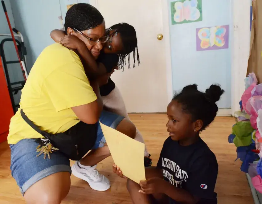 LaQuita White, Director of Children's Services for Stewpot Community Services, receives a hug while listening to a young artist describe the inspiration for her artwork during summer camp, Thursday, June 12, 2025 in Jackson. Credit: Vickie D. King/Mississippi Today