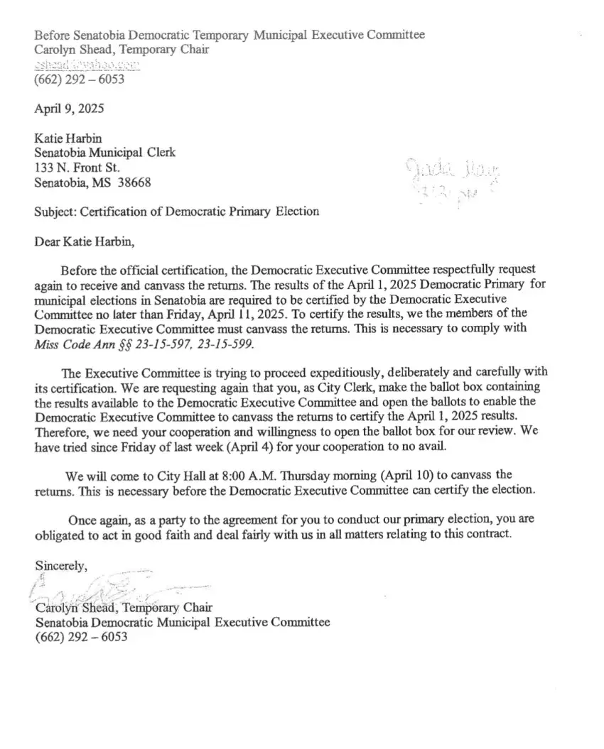 According to the Committee, Senatobia Municipal Clerk Katie Harbin informed the committee that they had no authority to review or certify the results, but in an email sent by Harbin to the committee on Tuesday, April 8, 2025 at 7:09 p.m., she requested the committee to certify the party nominations to the General election.