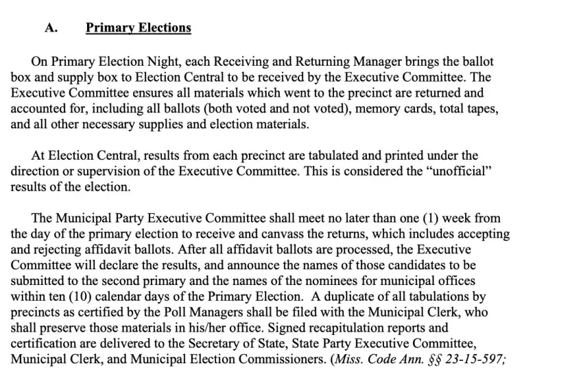 According to the 2025 Municipal Elections Handbook published by the Mississippi Secretary of State’s Office, during a primary election the Municipal Party Executive Committee shall meet no later than one week from the day of the primary election to receive and canvass the returns, which includes accepting and rejecting affidavit ballots.
