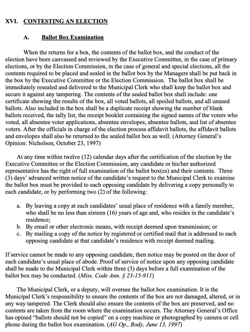 The Deputy Clerk Francis Johnson did not supervise the ballot box examination even though according to Mississippi Code § 21-15-23 a city can appoint one or more deputy city clerks who have all the power and authority of the city clerk.