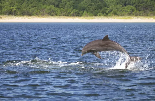 REEDVILLE, Va. (AP) — Three young male dolphins simultaneously break the water’s surface to breathe — first exhaling, then inhaling — before slipping back under the waves of the Chesapeake Bay.