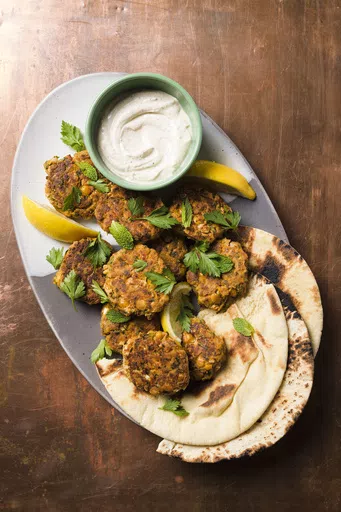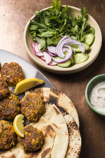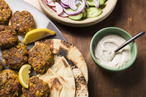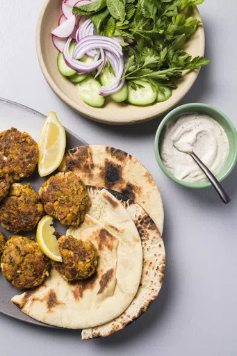 2 tablespoons grapeseed or other neutral oil, divided In a small bowl, stir together the yogurt, tahini, 4 teaspoons of lemon juice and 1 teaspoon of cumin. Transfer ⅓ cup of the mixture to a large bowl. Into the remaining yogurt mixture, stir the remaining 2 teaspoons lemon juice and ¼ teaspoon each salt and pepper; set aside for serving. To the large bowl, add the egg, paprika, cinnamon, the remaining ½ teaspoon cumin, ¾ teaspoon salt and 1 teaspoon pepper, then whisk to combine. Add the chickpeas and mash with a potato masher until broken down but not completely smooth. Add the feta and herb(s), then mix well. Form into 12 evenly sized balls (each about a scant ¼ cup); place on a plate and refrigerate for about 15 minutes. In a 12-inch nonstick skillet over medium, heat 1 tablespoon of oil until shimmering. Add 6 of the balls, spacing them evenly apart (return the remainder to the refrigerator), then flatten each with a metal spatula into a 2- to 2½-inch patty. Cook until golden brown on both sides, 3 to 4 minutes per side, gently flipping them once. Transfer to a platter and tent with foil. Wipe out the skillet and repeat with the remaining oil and patties. Top the keftedes with whole or torn herb(s) and serve with the yogurt-tahini sauce and lemon wedges. EDITOR’S NOTE: For more recipes, go to Christopher Kimball’s Milk Street at 177milkstreet.com/ap