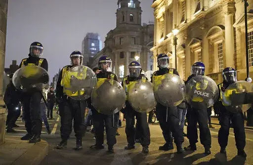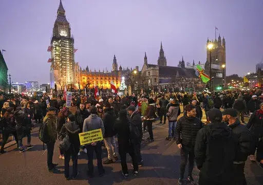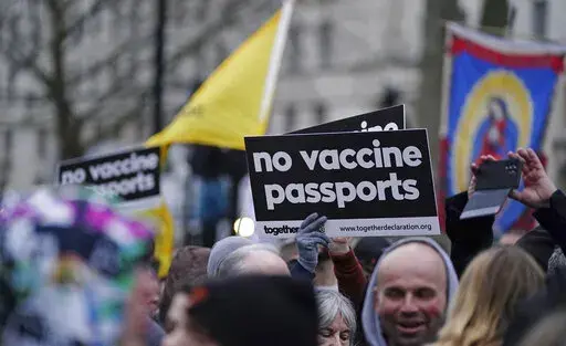 Hundreds of people blocked traffic as they marched with signs bearing slogans such as “Vaccine passports kill our freedoms” and “Don’t comply.” Other signs had the faces of Johnson or U.K. Health Secretary Sajid Javid and read, “Give them the boot.”