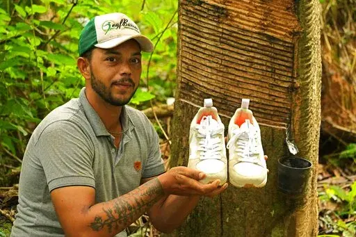 XAPURI, Brazil (AP) — Rubber tapper Raimundo Mendes de Barros prepares to leave his home, surrounded by rainforest, for an errand in the Brazilian Amazon city of Xapuri. He slides his long, scarred, 77-year-old feet into a pair of sneakers made by Veja, a French brand.