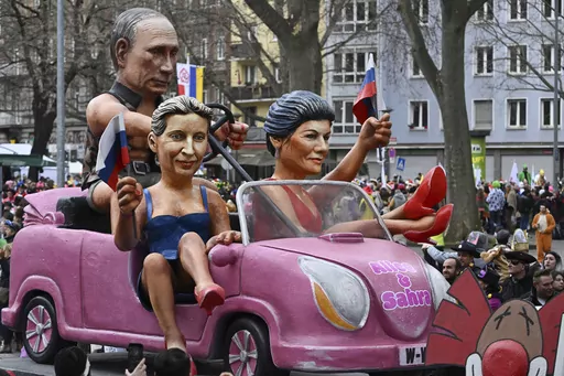 In Mainz, a “Barbies and Ken” pink car float featured Russian President Vladimir Putin behind the co-leaders of two German political parties, the far-right Alternative for Germany and the new Sahra Wagenknecht Alliance, that criticize sanctions against Russia and oppose weapons deliveries to Ukraine.