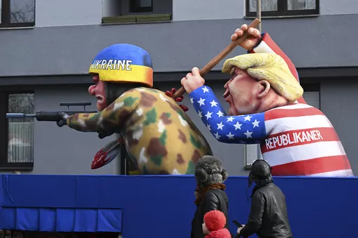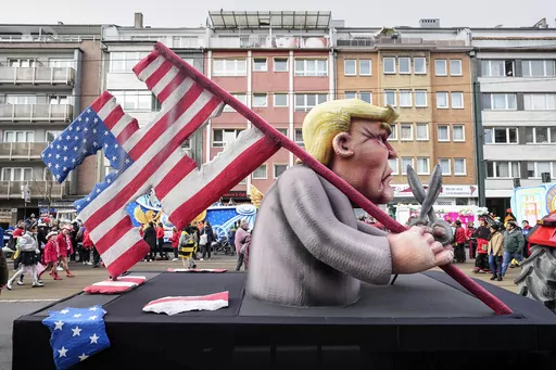 DUESSELDORF, Germany (AP) — Throngs of revelers took to the streets of Germany's Carnival strongholds on Monday, accompanied by floats that satirized the Ukrainian and Russian presidents, German politicians, former U.S. President Donald Trump and many others.
