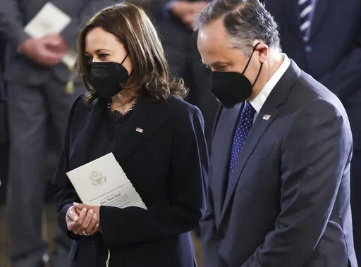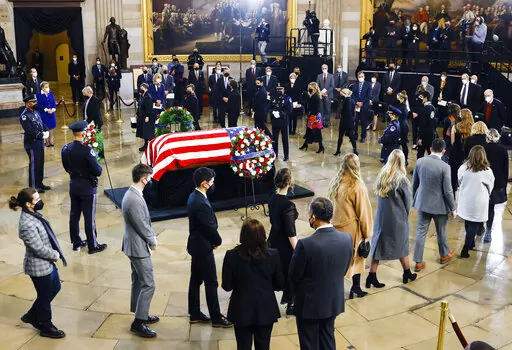 Vice President Kamala Harris did not speak during the ceremony, but paused at the casket in tribute, as did the Republican leaders in Congress, Sen. Mitch McConnell of Kentucky and Rep. Kevin McCarthy of California. Later, Justices Sonia Sotomayor and Elena Kagan stopped by, as did some Cabinet and administration officials.