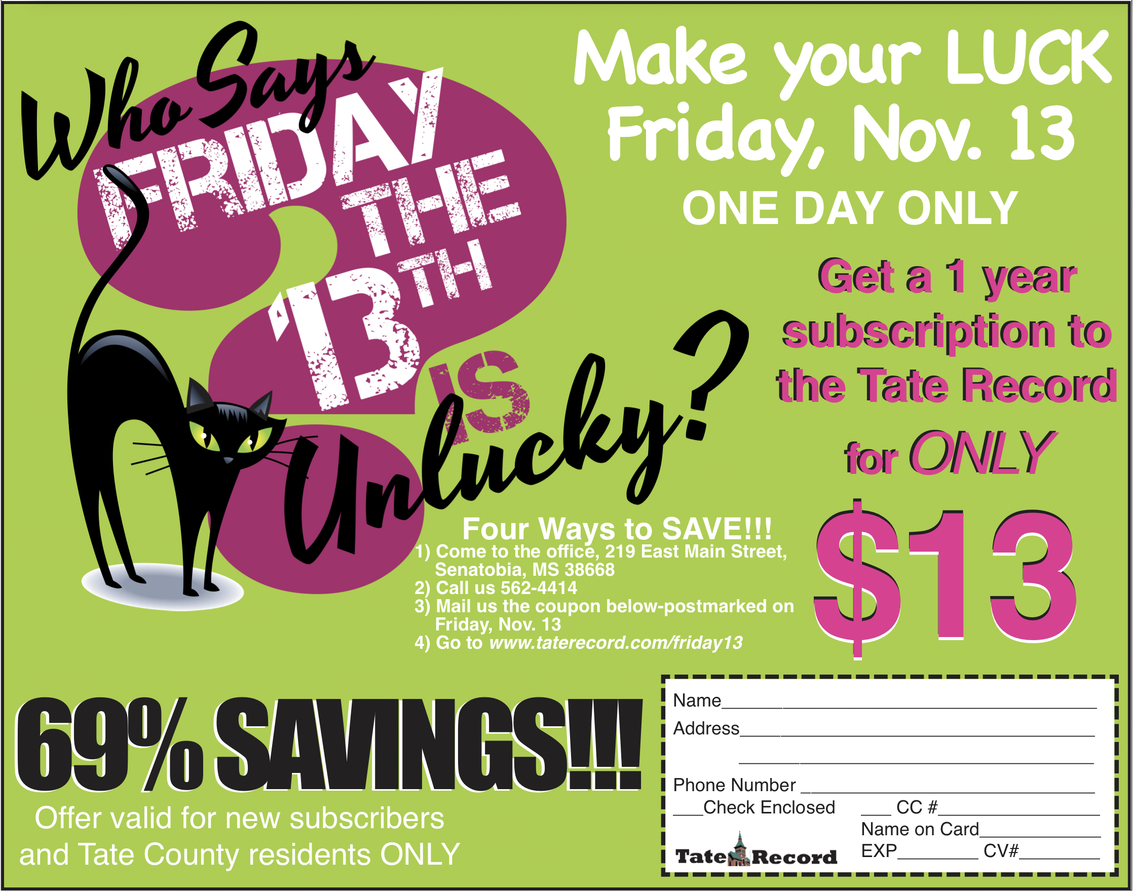 There are four ways to subscribe on Friday, Nov 13: Call 662-562-4414; come by the office, 219 East Main Street, Senatobia, MS 38668; mail a letter and check postmarked with that date or go to https://www.taterecord.com/friday