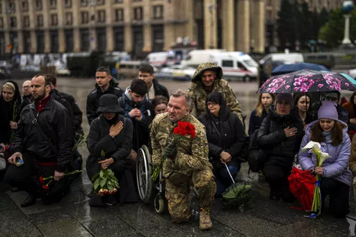 But reminders of the dead are all around: in the sea of yellow and blue flags in Independence Square, and the memorial wall outside St. Michael’s Golden-Domed Monastery, where people leave flowers in front of photos of fallen troops.