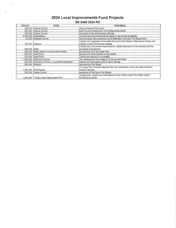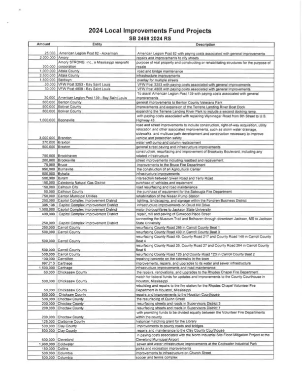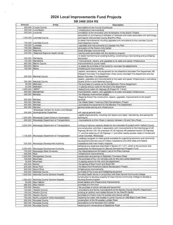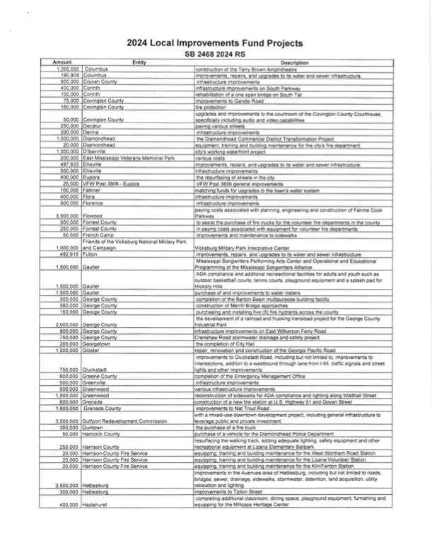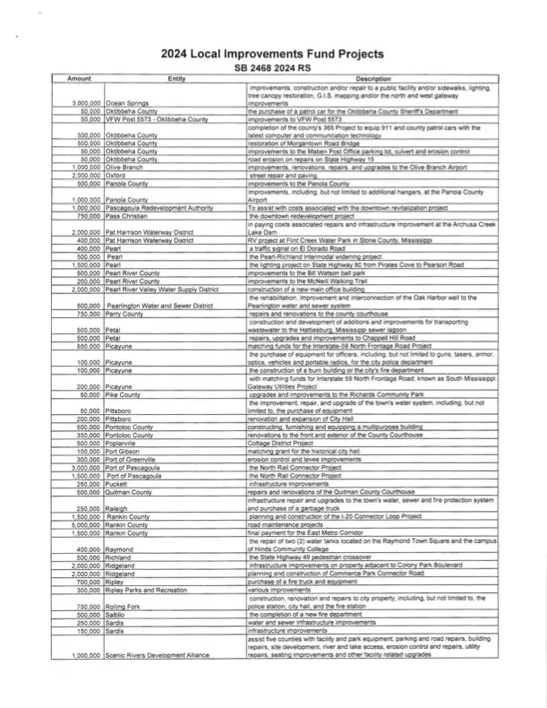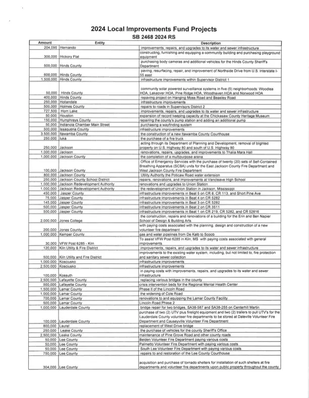 “I want to say that it is not lost on me that in total these expenditures constitute a significant amount of taxpayer dollars that we are responsible for. Although I am very glad to help local governments with their real needs, I am just as proud to be leading the effort to cut and reform our tax system in Mississippi. I believe my work to reduce and hopefully eliminate the income tax in Mississippi will be recorded in history as one of the greatest achievements we secured for the people of our great state during my time in public office and I am honored to continue that fight for our hardworking people,” said Lamar.