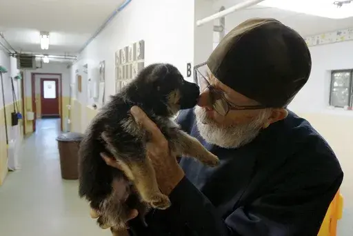Lucy and Iso excitedly woofed as they spotted the Orthodox monk, who heads the monastery’s German shepherd breeding program, coming to take them and 10-week-old Pyrena for their morning walks.