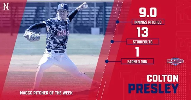 Following a career-defining performance on the mound in Saturday's Game 1 victory against Mississippi Gulf Coast, Northwest sophomore lefty Colton Presley has been selected as this week's MACCC Pitcher of the Week, the conference announced on Tuesday morning.