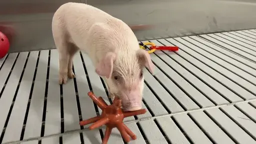 Company video shows piglets running around behind the protective barrier, chewing on toys and nosing balls back and forth.