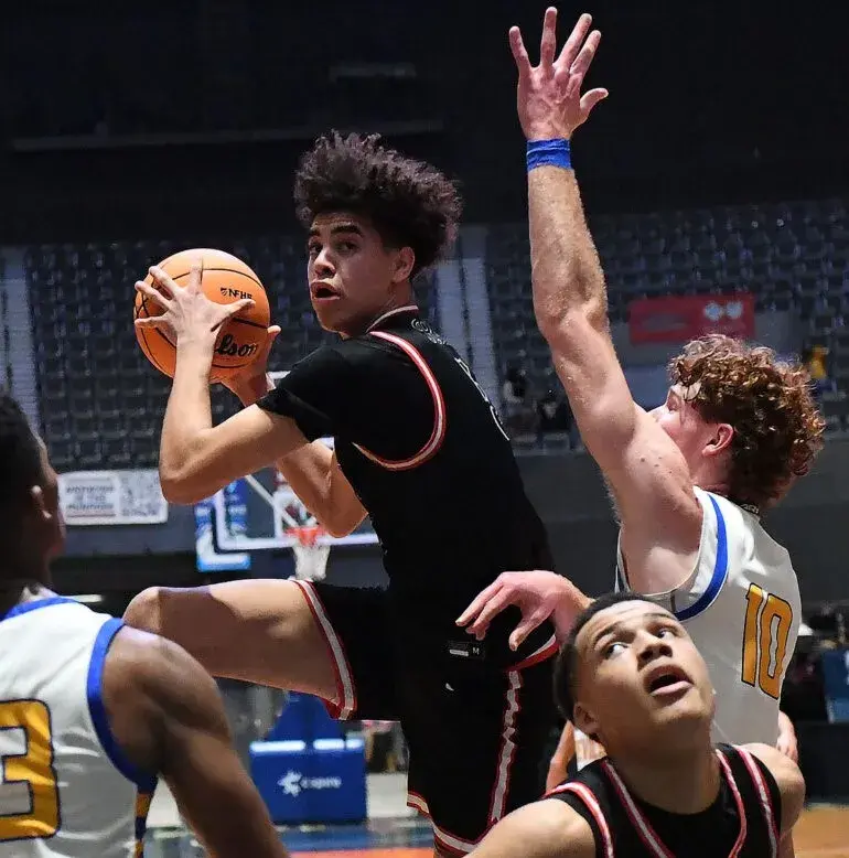 St. Stanislaus star Max Baria, with ball, grabs a rebound over Booneville's Elijah Dukes during the Boys Class 3A semifinal game, Wednesday, March 4, 2026, at the Mississippi Coliseum in Jackson. Credit: Vickie D. King/Mississippi Today