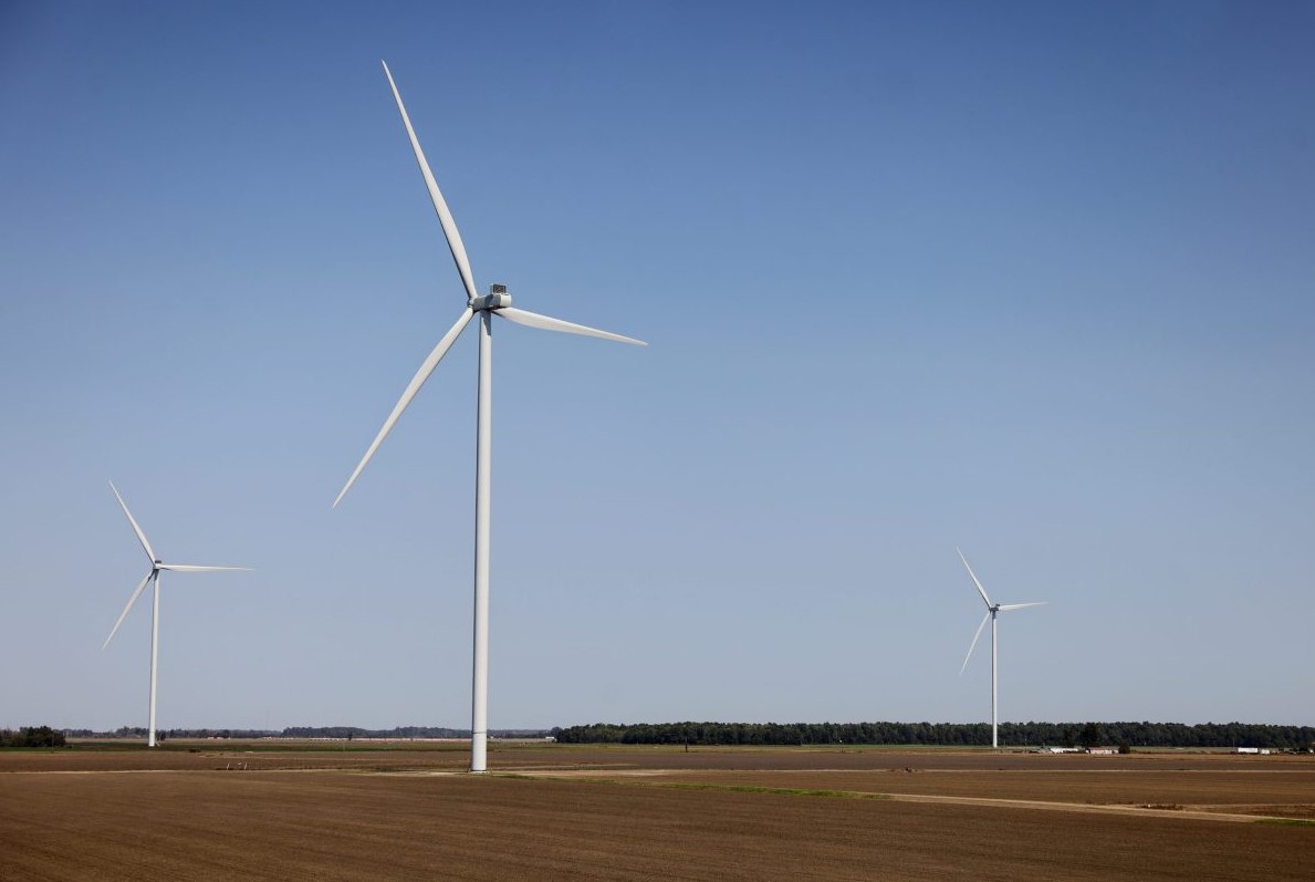 Farmland in Dundee, Miss., is overlooked by rotating wind turbines on Oct. 14, 2024. Credit: Eric Shelton/Mississippi Today