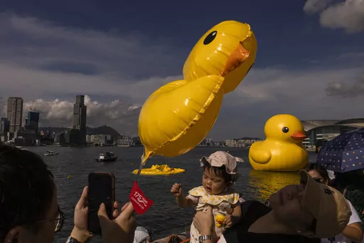 HONG KONG (AP) — One of the two giant inflatable ducks floating in Hong Kong's Victoria Harbor deflated on Saturday, just a day after they were unveiled to revelers.