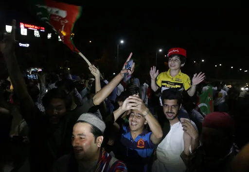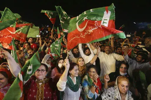 In the southern Arabian Sea port city of Karachi more than 20,000 shouted slogans promising Khan's return to power. In the capital of Islamabad, the lights from thousands of supporters lit up the night sky as Khan made his way through the crowd atop a brightly colored truck.