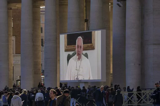 As he did a week earlier, Francis delivered very brief remarks from the chapel of the Vatican hotel where he lives and where he is recovering from what he has said is infectious bronchitis. Thousands of people in the square followed his words from giant screens set up outdoors.