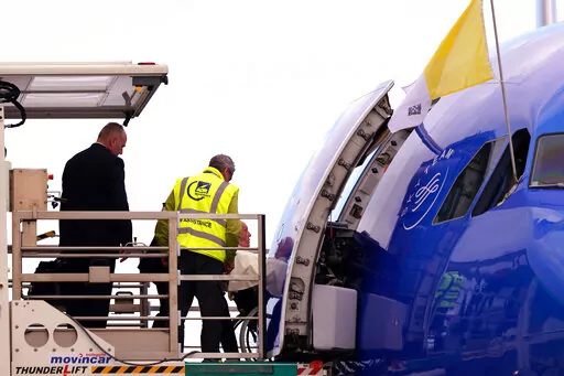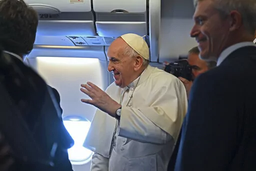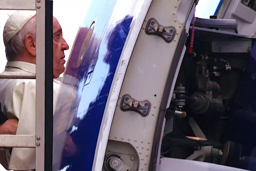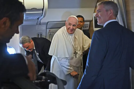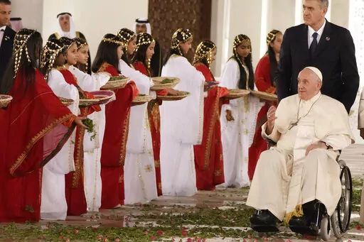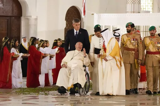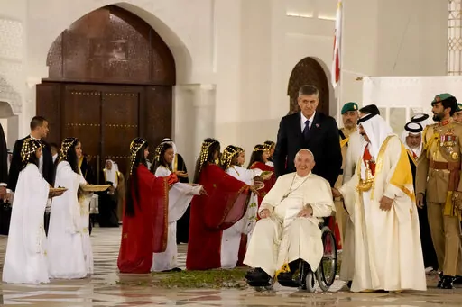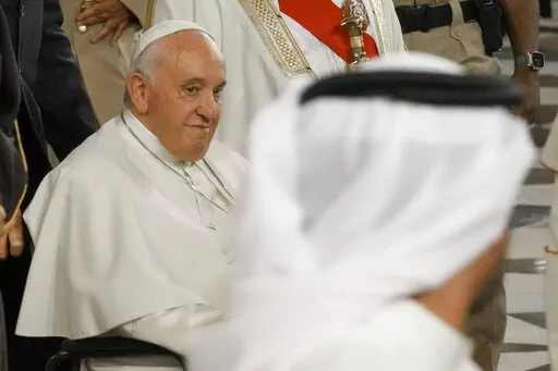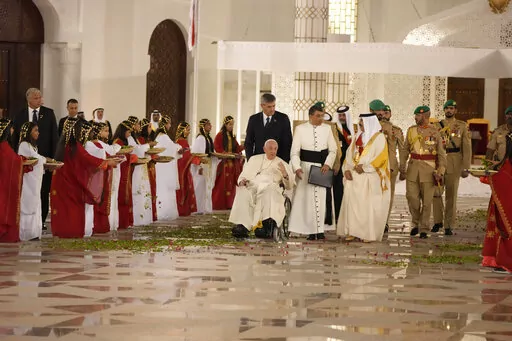 The 85-year-old Francis, who has been using a wheelchair for several months because of strained knee ligaments, said he was “in a lot of pain” as he flew to the Gulf. For the first time, he greeted journalists travelling with him seated rather than walking through the plane’s aisle.