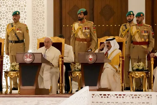 Francis referred indirectly to the sectarian strife as he arrived in the desert town of Awali and met with Al Khalifa at the Sakhir royal palace in the first-ever papal visit to Bahrain. Speaking to government authorities and diplomats from the palace's glistening courtyard, Francis praised Bahrain’s tradition of tolerance and cited Bahrain's constitution, which forbids discrimination on the basis of religion, as a stated commitment that needs to be put into practice.