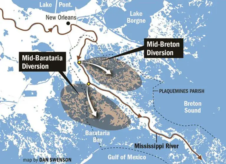 There is a proposed $800 million Mid-Breton Diversion Project that is a gated structure on the east bank of the Mississippi River designed to divert Mississippi River water into the Breton Sound, where marsh has largely disappeared. There is a similar project, Mid-Barataria Diversion Project, that is designed to redirect river water from the west bank into Barataria Bay.