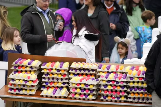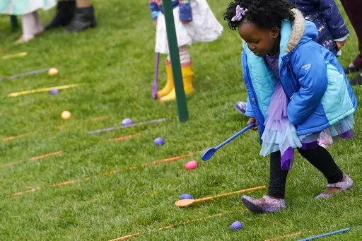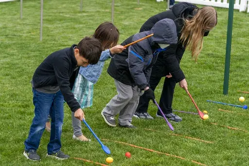 After their remarks, the president and first lady went down to the lawn to watch as groups of children used wooden spoons to coax brightly dyed hard-boiled eggs across a patch of wet grass to the finish line.
