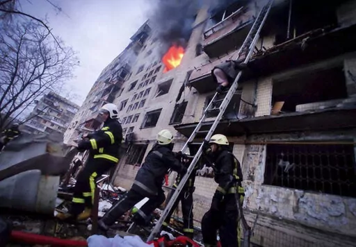 After Russian forces shelled a nine-story apartment building in the northern Obolonskyi district of Kyiv, firefighters worked to rescue survivors, painstakingly carrying an injured woman on a stretcher away from the blackened and still smoking building.