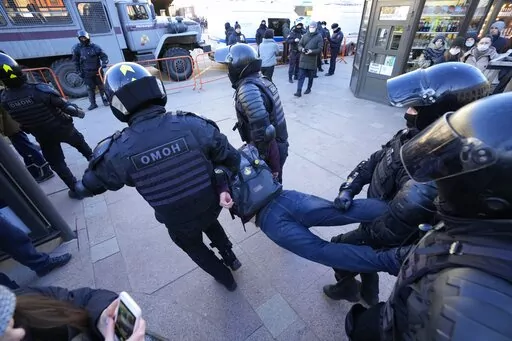 In St. Petersburg, where several hundred gathered in the city center, police in full riot gear were grabbing one protester after another and dragging some into police vans, even though the demonstration was peaceful. Footage from Moscow showed police throwing several female protesters on the ground before dragging them away.
