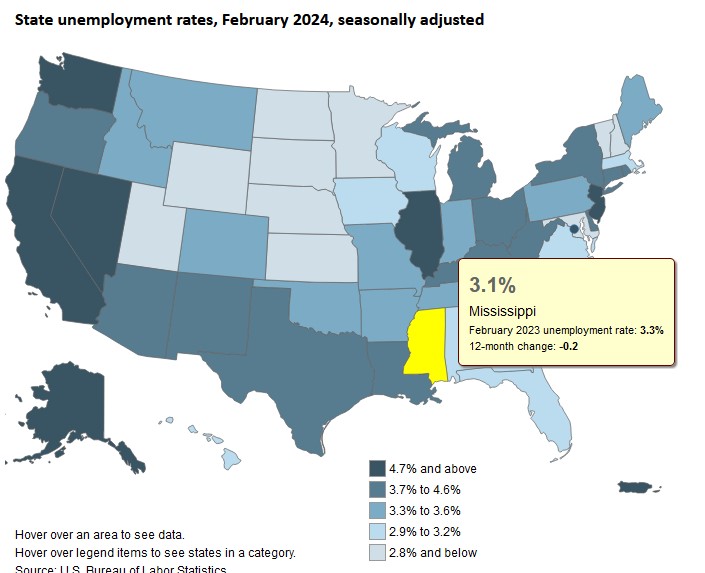 The current unemployment rate for Mississippi (as of February 2024) stands at 3.1 percent.