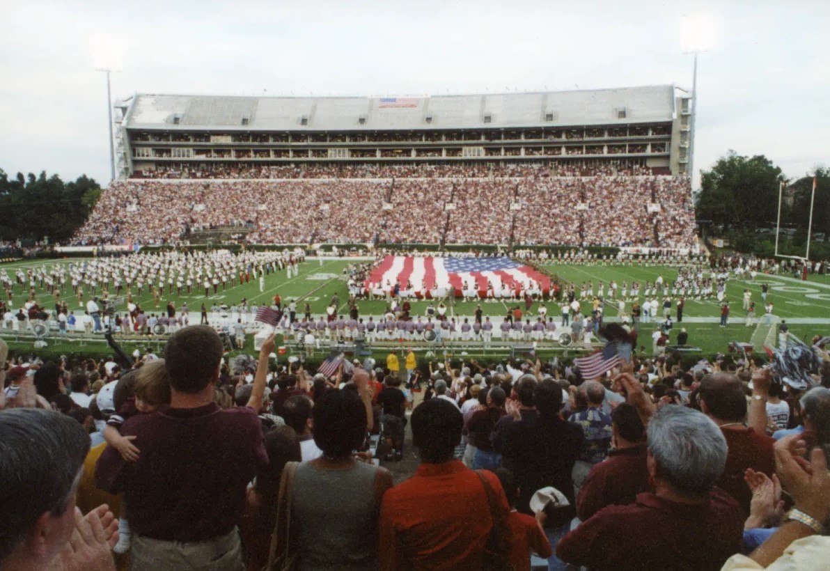 If you were there, no way you have forgotten. There’s a good chance you have forgotten the score. You may have even forgotten that Lou Holtz was the Gamecocks coach. But you can’t have forgotten the eerie feeling of approaching and entering Scott Field that evening with all that security not knowing what to expect. You can’t have forgotten the amazing display of patriotism that ruled the night, or the South Carolina and Mississippi State players, who marched onto the field and held up a gigantic American flag in pre-game ceremonies.