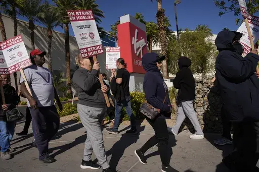 LAS VEGAS (AP) — A walkout by hundreds of hospitality workers at a casino near the Las Vegas Strip entered its second day with union members willing to undergo the financial hardships of being out of work as they wait for a new contract.
