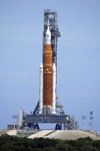 The 322-foot (98-meter) rocket — the most powerful ever built by NASA — remains on its pad at Kennedy Space Center with an empty crew capsule on top.