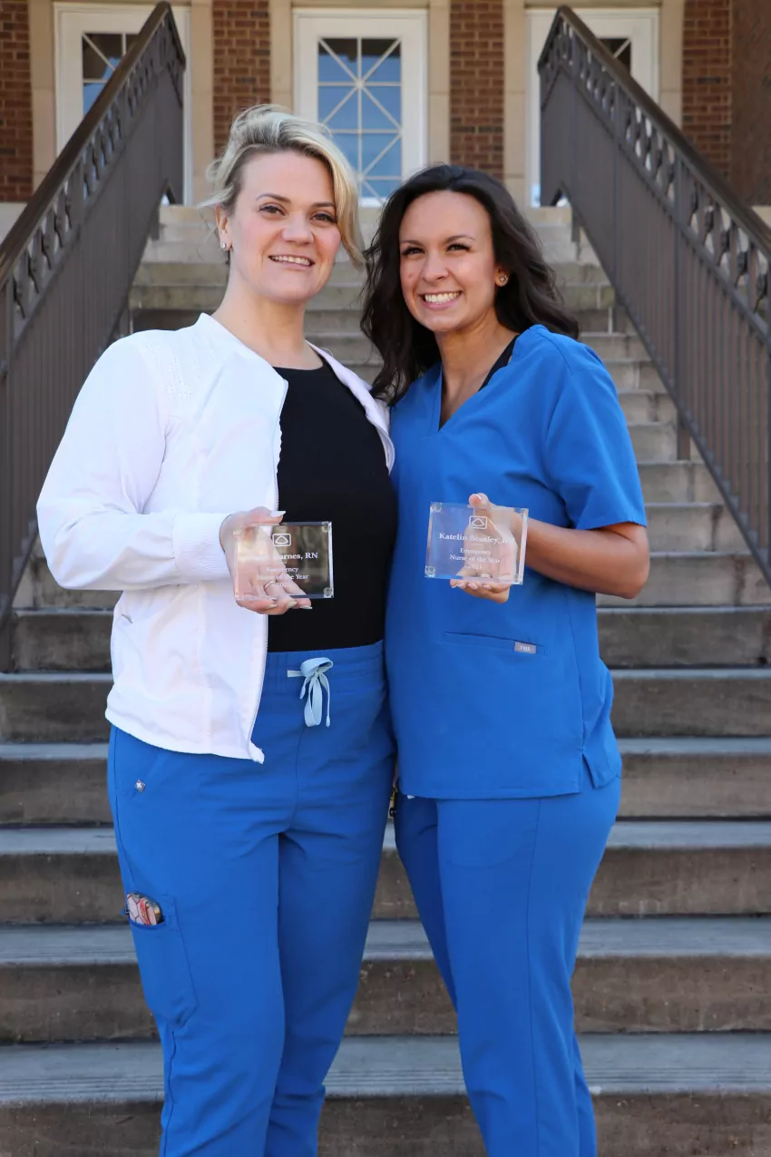 Northwest Mississippi Community College Nursing alumnae Elaine Karnes, left, a 2019 Northwest Nursing graduate, and Katelin Bozeman, a 2018 Northwest Nursing graduate, have been selected to share the honor of 2021 Emergency Nurse of the Year at Baptist Memorial Hospital – DeSoto.