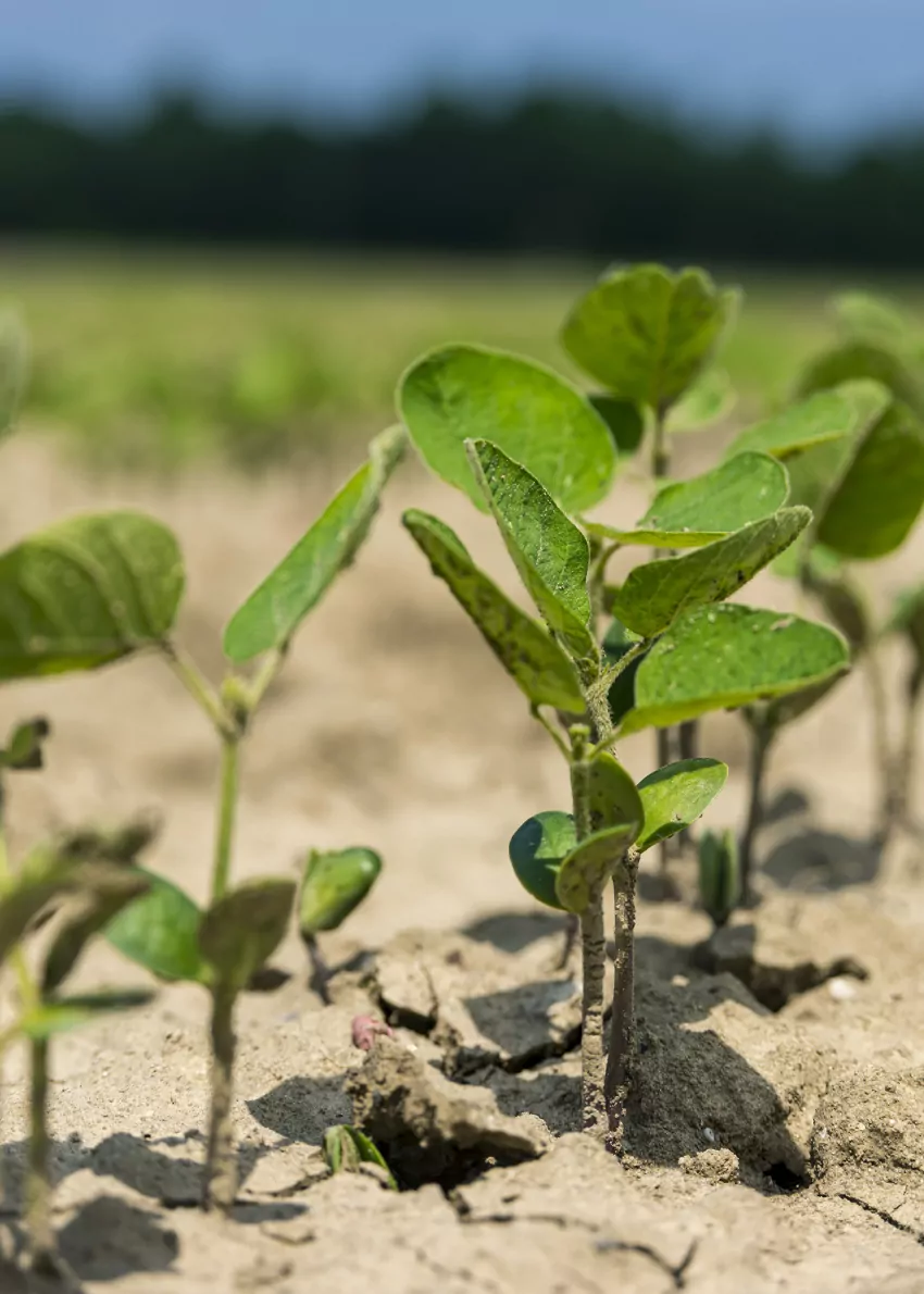 Soybeans emerge in a research field May 15 at the R.R. Foil Plant Science Research Center (North Farm) in Starkville, Mississippi. On the week ending June 4, 93% of Mississippi’s soybean crop was in the ground, and 87% was reported emerged; both percentages are just ahead of state five-year averages. (Photo by MSU Extension Service/Kevin Hudson)