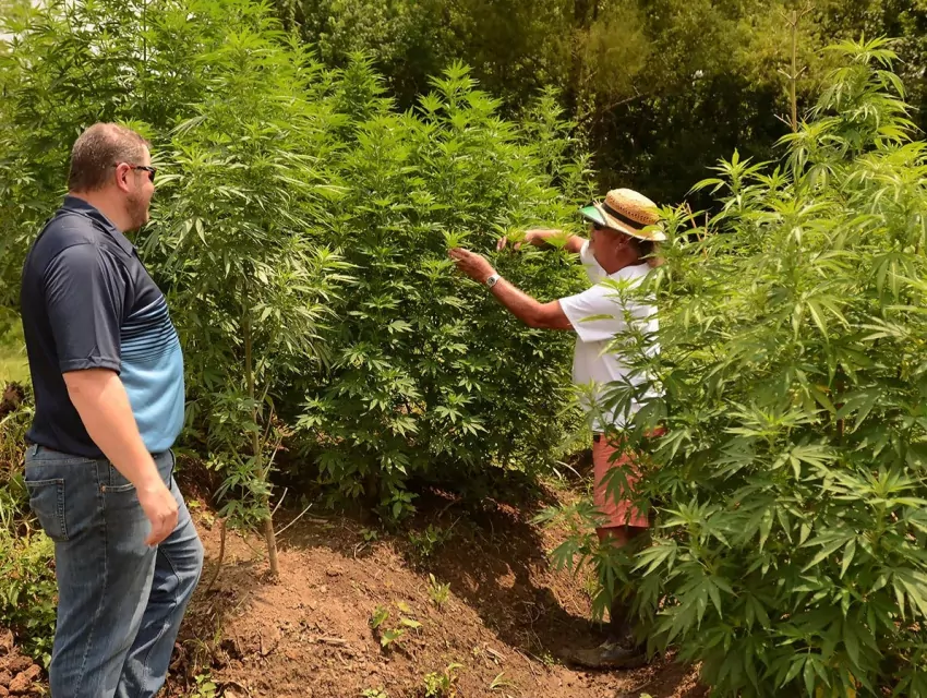Tony Engle(left) with hemp seed producer GeneSeed in Tennessee and hemp farmer David Singletary examine plant growth at Singletary's farm in Florence, Tuesday, August 3, 2021. Hemp contains cannabidiol (CBD), which does not produce the high associated with tetrahydrocannabinol (THC), in its cousin marijuana. Credit: Vickie D. King/Mississippi Today