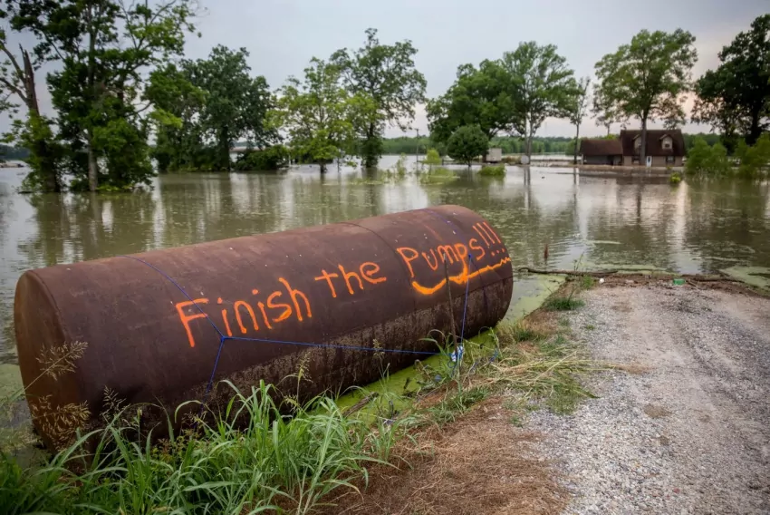 John Adam Nowlin of Ecru believes chemicals from a nearby fertilizer plant caused the contamination of water on his property that sickened and killed his livestock. Nowlin, near a pond on his land where he has posted a warning sign, Friday, May 20, 2022. Credit: Vickie D. King/Mississippi Today
