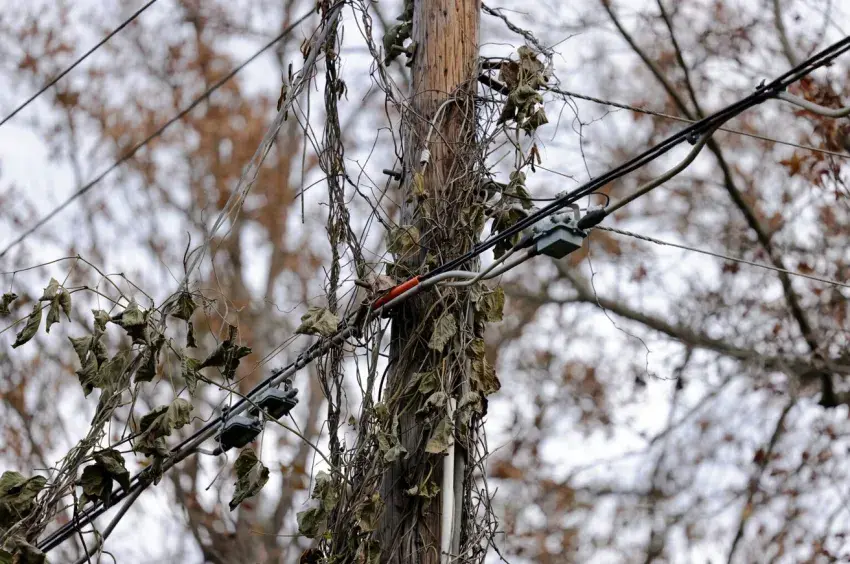 Vegetation grows on power lines near Ashland, Miss., on Wednesday, Dec. 4, 2024. Persistent maintenance issues have contributed to years of unreliable power for residents served by the Holly Springs Utility Department, a problem worsened by an ice storm in 2023. Credit: Eric Shelton/Mississippi Today